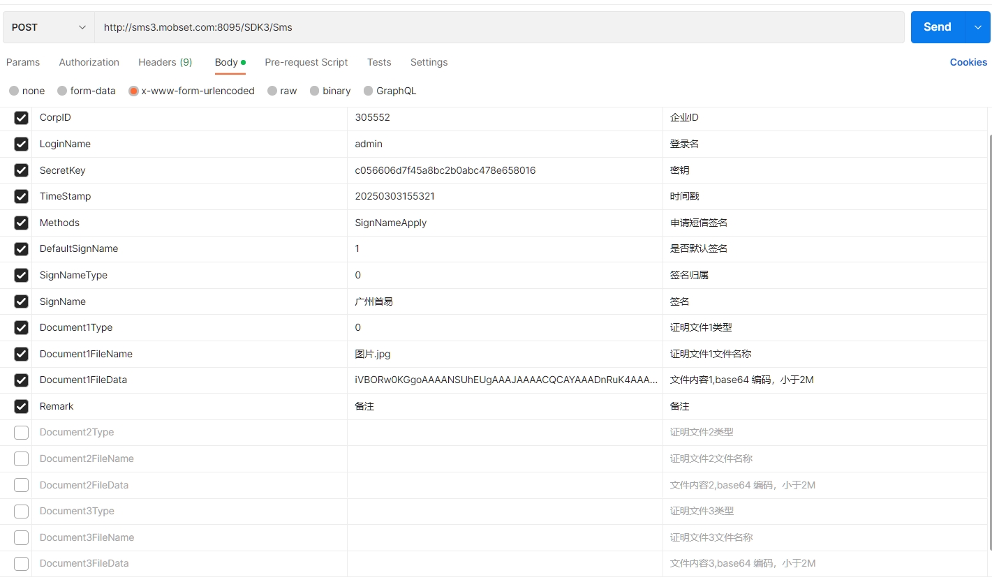 CorpID=305552&LoginName=admin&SecretKey=c056606d7f45a8bc2b0abc478e658016&TimeStamp=20250303155321&Methods=SignNameApply&DefaultSignName=1&SignNameType=0&SignName=广州首易&Document1Type=1&Document1FileName=type1.png&Document1FileData=base64字符串&Remark=测试申请签名