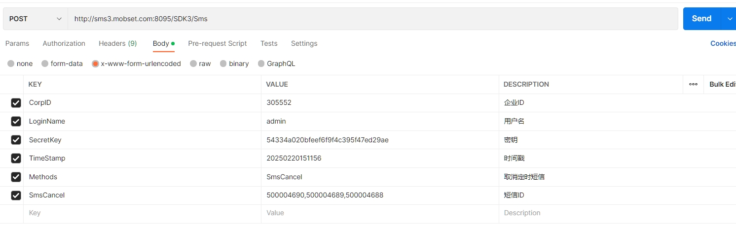 Methods=SmsCancel&CorpID=305552&LoginName=admin&SecretKey=54334a020bfeef6f9f4c395f47ed29ae&TimeStamp=20250220151156&SmsID=500004690,500004689,500004688