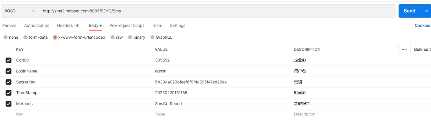 RequestBody body = RequestBody.create(mediaType, "CorpID=305552&LoginName=admin&SecretKey=37d290f0264235af11f2a32e62351e24&TimeStamp=20250220151156&Methods=SmsGetReport");