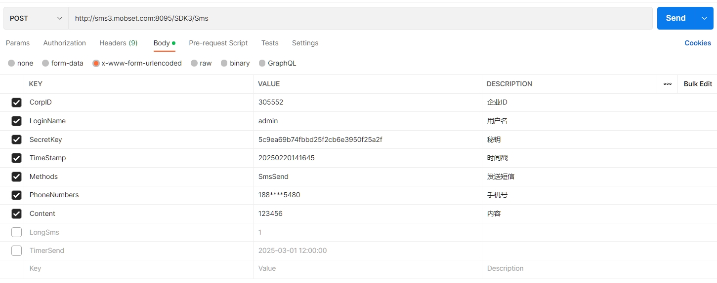 CorpID=305552&LoginName=admin&SecretKey=bd075468ee0c514840d157558e451815&TimeStamp=20250220141645&Methods=SmsSend&PhoneNumbers=18800000000&Content=验证码:123456&LongSms=1&TimerSend=2025-02-20 12:00:00&AddNum=001